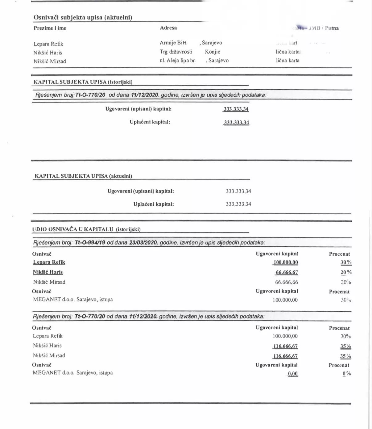 Kako se može vidjeti iz ovog izvoda, Grabovicina firma Meganet se povukla iz vlasničke strukture Carbid Alata, a umjesto njega novi suvlasnik je Refik Lepara. U pitanju je otac direktorice JU Apoteke Sarajevo Zenaide Hasić koja na ovu poziciju došla upravo zahvaljujući svojim vezama sa Nerminom Nikšićem.