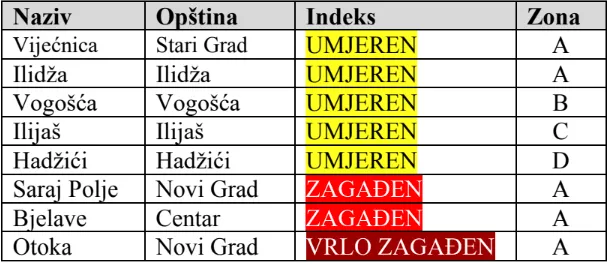zraka, dok je na mjernim stanicama Saraj Polje i Bjelave evidentiran zagađen, a na lokalitetu Otoka vrlo