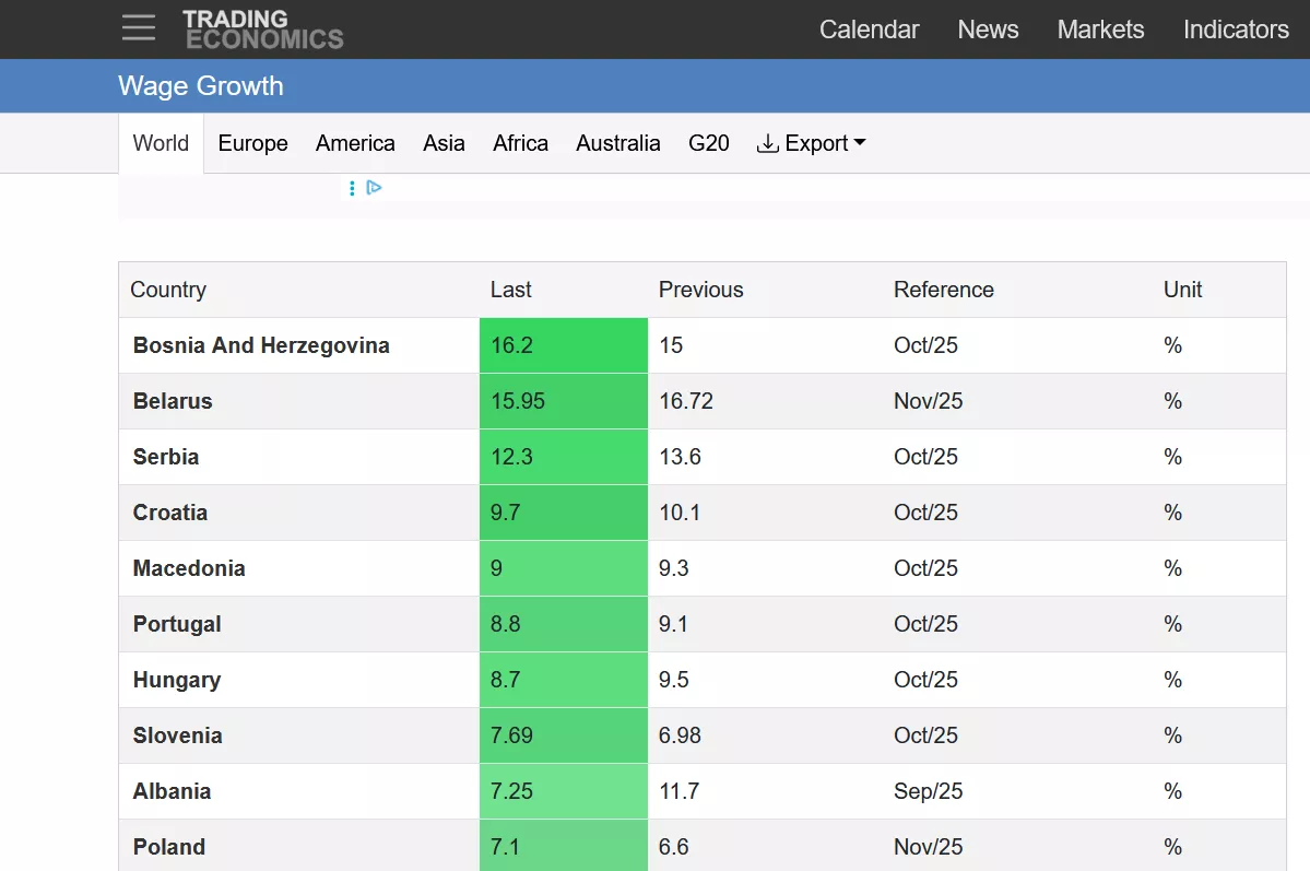 (Patria) - Bosna i Hercegovina na prvom je mjestu u svijetu po rastu plata, pokazao je najnoviji izvještaj Trading Economicsa - organizacije koja se bavi ekonomskim izvještajima i finansijskim statistikama.