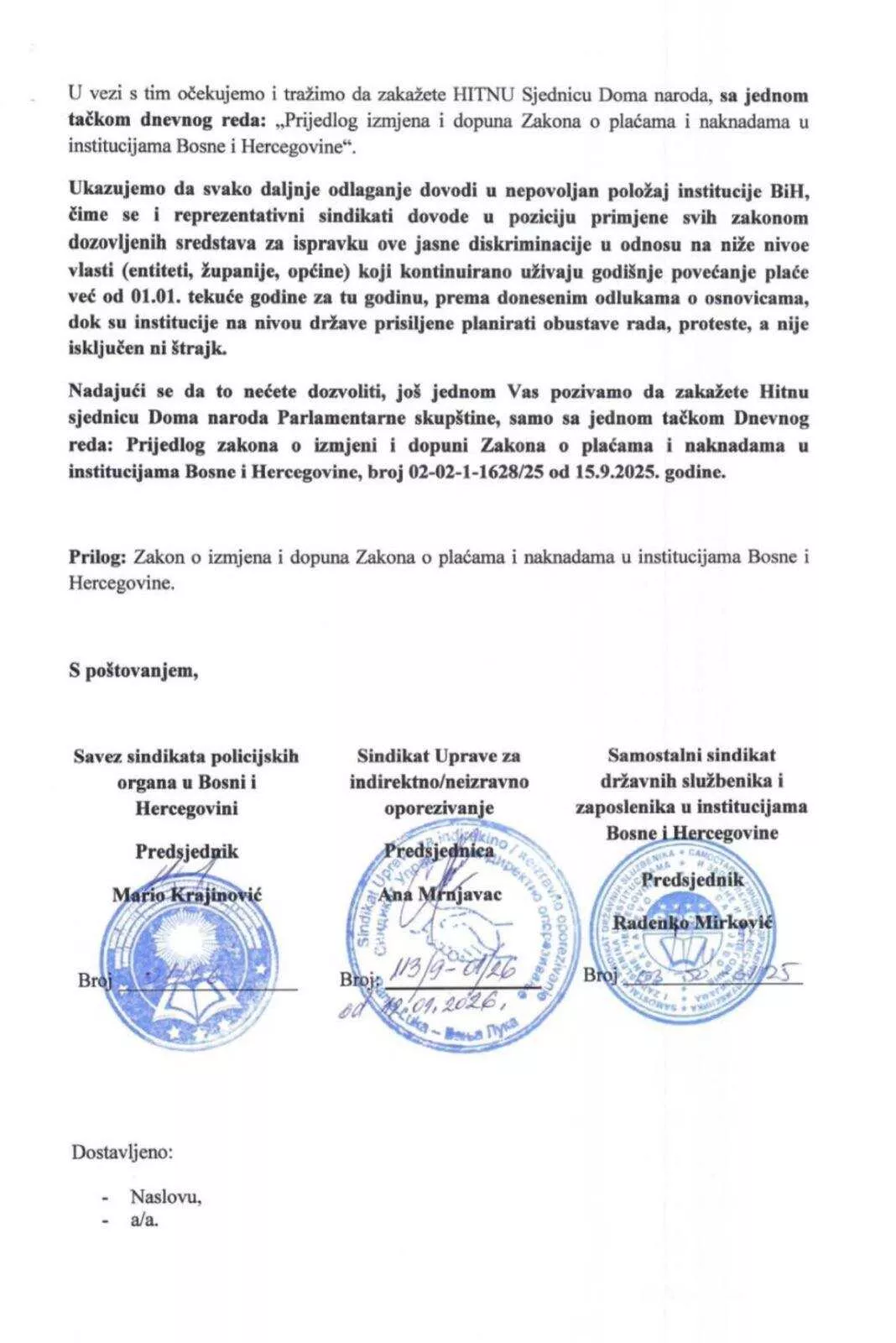 Kako navode u svom dopisu svako dalje odlaganje dovodi u nepovoljan položaj institucije BiH, čime se i reprezentativni sindikati dovode u poziciju primjene svih zakonom dozvoljenih sredstava za zaštitu svojih prava, uključujući proteste, obustave rada, pa i štrajk.