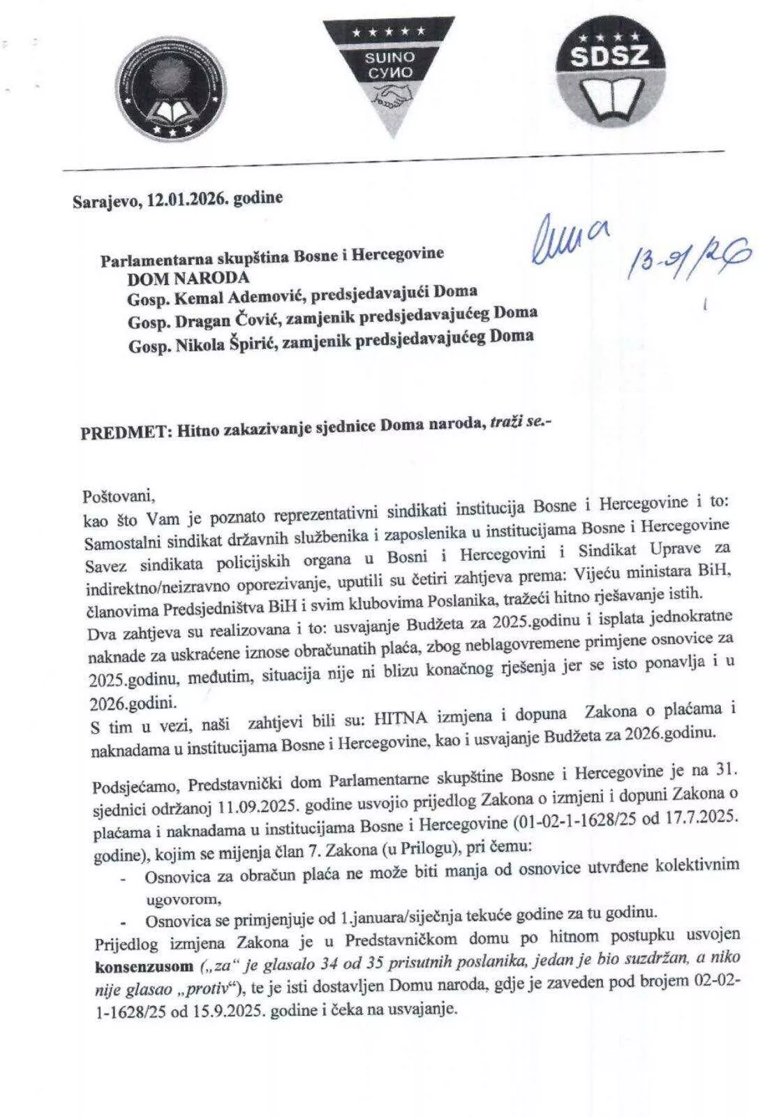 Sindikati Uprave za indirektno oporezivanje, Savez sindikata policijskih organa u BiH, te Samostalni sindikat državnih službenika i zaposlenika u institucijama BiH uputio je 12. januara zahtjev rukovodstvu Doma naroda PS BiH za hitnom sjednicom na kojoj bi se razmatrao Zakon o izmjenama i dopunama Zakona o plaćama i naknadama u institucijama BiH.