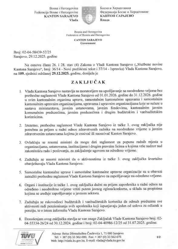 (Patria) - Vlada Kantona Sarajevo krajem decembra 2025. godine je donijela zaključak kojim nastavlja sa moratorijem na upošljavanje na neodređeno vrijeme bez prethodne saglasnosti Vlade KS tokom 2026. godine u svim kantonalnim organima uprave, samostalnim kantonalnim upravama i samostalnim kantonalnim upravnim organizacijama, uprava i upravnim organizacijama koje se nalaze u sastavu ministarstava, javnim ustanovama, javnim fondovima, kantonalnim javnim komunalnim preduzećima, javnim preduzećima i drugim budžetskim i vanbudžetskim korisnicima.