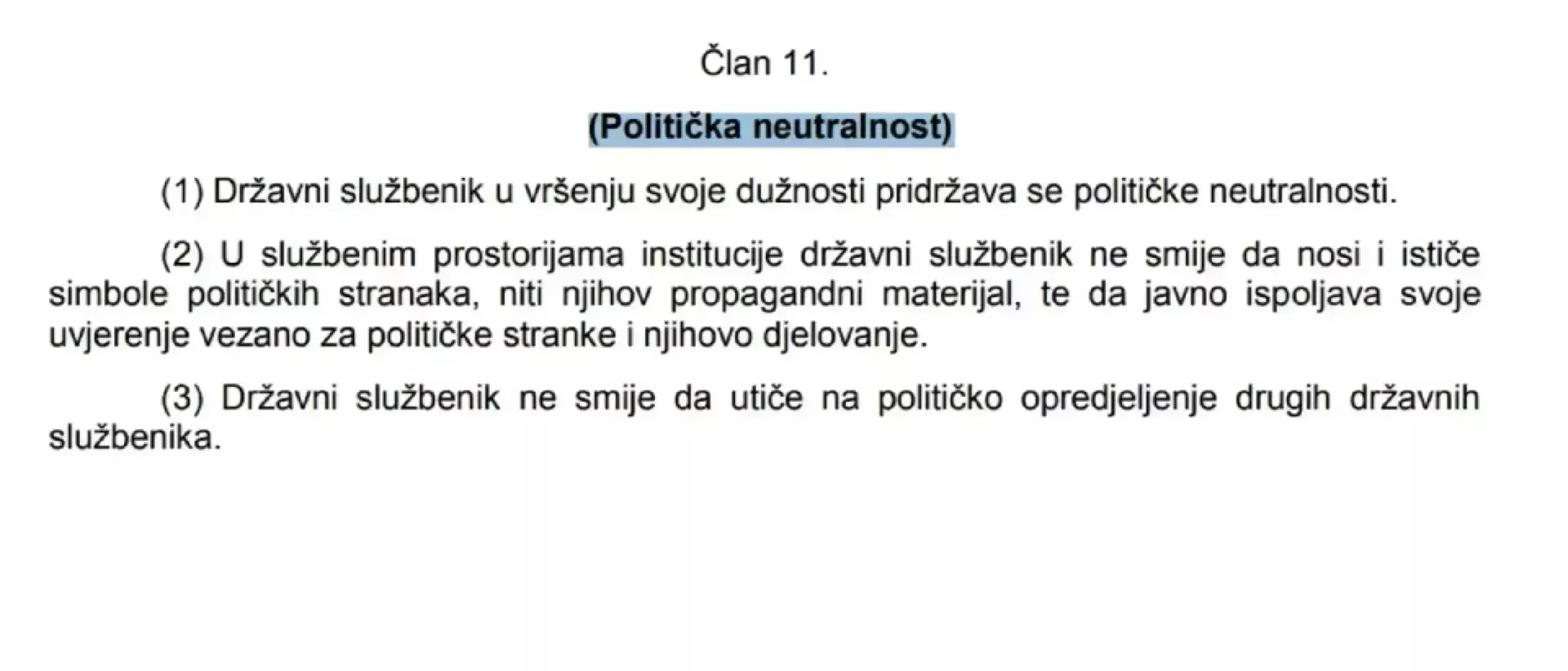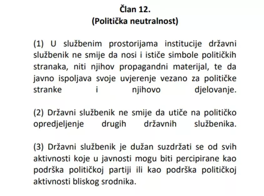 Član 11 etičkog kodeksa državnih službenika na nivou BiH, baš kao i član 12 kodeksa na nivou FBiH definišu šta državni službenici ne smiju raditi u pogledu političkih pripadnosti i svoje političke opredijeljenosti.