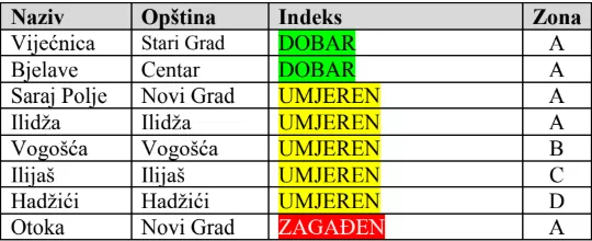 Na mjernim lokacijama Vijećnica i Bjelave zabilježen je dobar kvalitet zraka, dok je na lokalitetima Saraj Polje, Ilidža, Vogošća, Ilijaš i Hadžići evidentiran umjeren kvalitet zraka. Na mjernoj lokaciji Otoka zabilježen je zagađen kvalitet zraka.