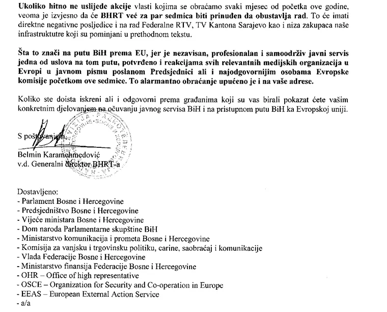 Vršilac dužnosti generalnog direktora BHRT-a Belmin Karamehmedović upozorio je na to nadležne institucije, Predsjedništvo BiH, Vijeće ministara BiH, OHR, Delegaciju EU, nadležne parlamentarne komisije, Vladu FBiH napominjući ih da je njihov osnivač Parlamentarna skupština BiH jedanaesti put.