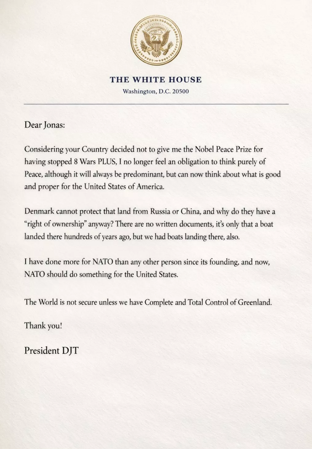 "S obzirom na to da je vaša zemlja odlučila ne dodijeliti mi Nobelovu nagradu za mir za to što sam zaustavio osam i više ratova, više ne osjećam obavezu razmišljati isključivo o miru, iako će on uvijek biti prevladavajući, već sada mogu razmišljati o onome što je dobro i ispravno za SAD."