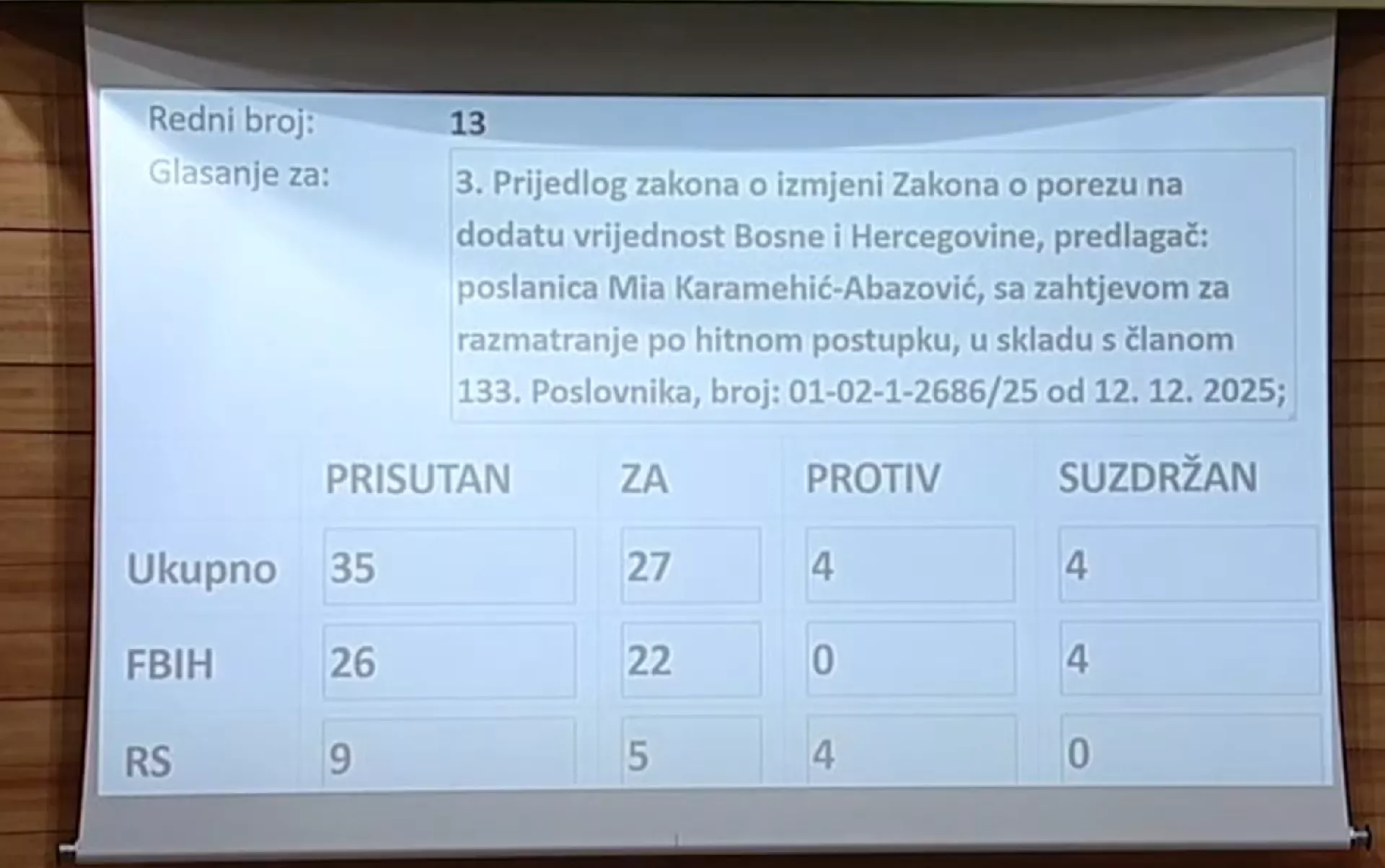 (Patria) - Zastupnički dom Parlamenta BiH po hitnom je postupku večeras usvojio Prijedlog zakona o izmjeni Zakona o porezu na dodatu vrijednost BiH, na prijedlog zastupnice Mie Karamehić-Abazović.