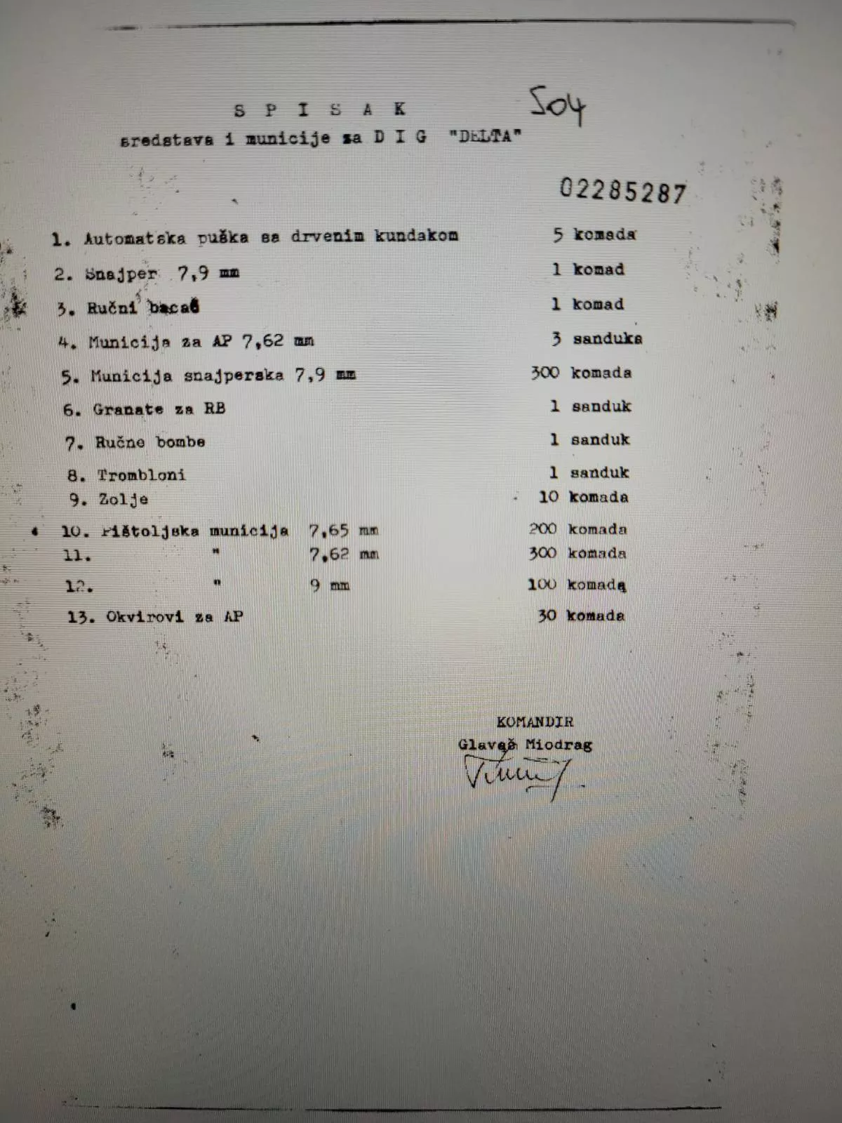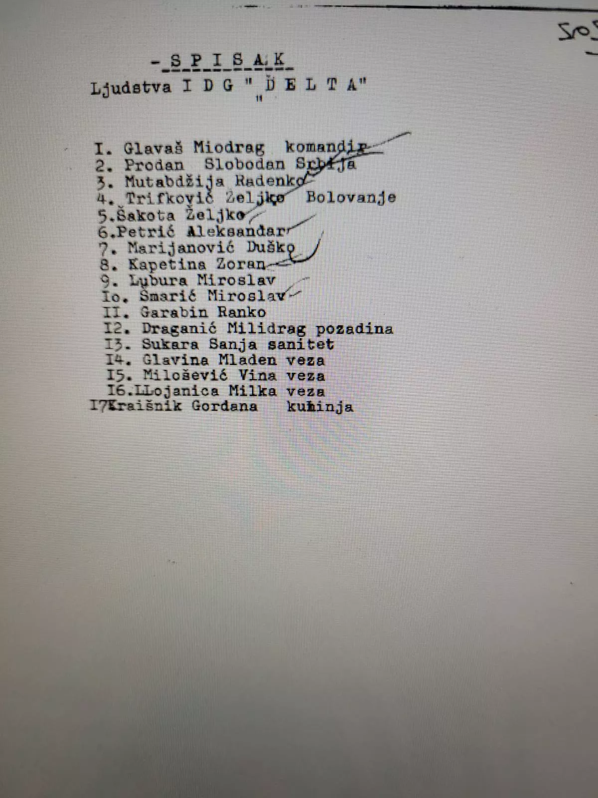 U jednom od dokumenata nalazi se i spisak pripadnika jedinice IDG „Delta“, na kojem su navedeni: Miodrag Glavaš (komandir), Slobodan Prodan, Radenko Mutabdžija, Željko Trifković, Željko Šakota, Aleksandar Petrić, Duško Marijanović, Zoran Kapetina, Miroslav Lubura, Ranko Garabin, Milidrag Draginić, Sanja Sukara (sanitet), Mladen Glavina (veza), Vina Milošević (veza), Milka Lojanica (veza) i Gordana Krajišnik (kuhinja).