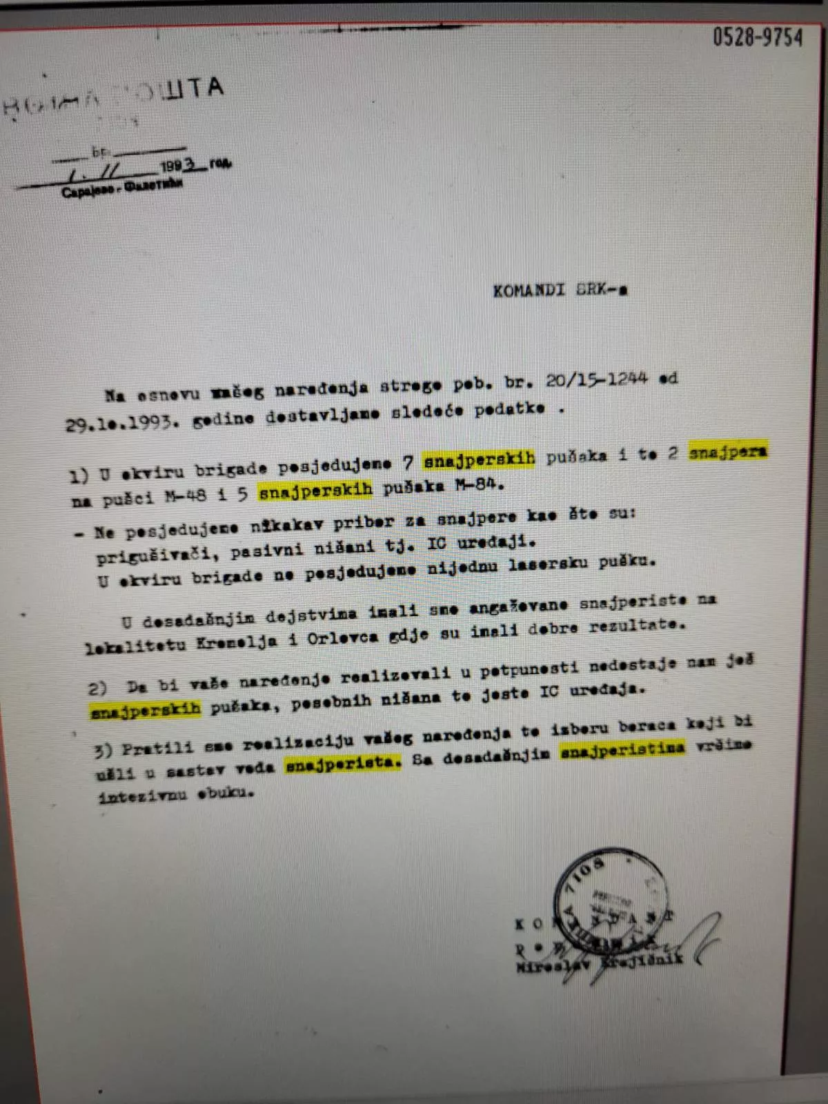 Tako se u dokumentima iz 1993. godine navodi da Miroslav Krajišnik obavještava nadređene kako brigada raspolaže sa sedam snajperskih pušaka te da je započeta realizacija naređenja koja uključuje izbor boraca za formiranje snajperskog voda, dok se obuka vrši uz angažman već aktivnih snajperista.