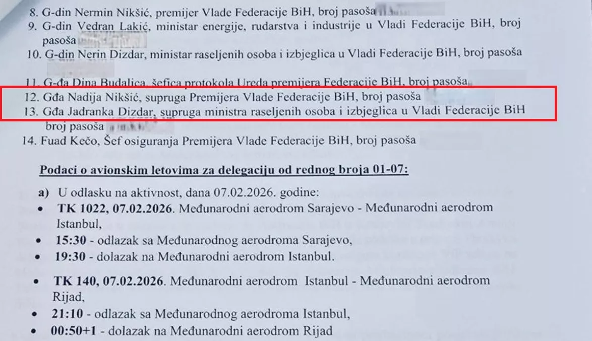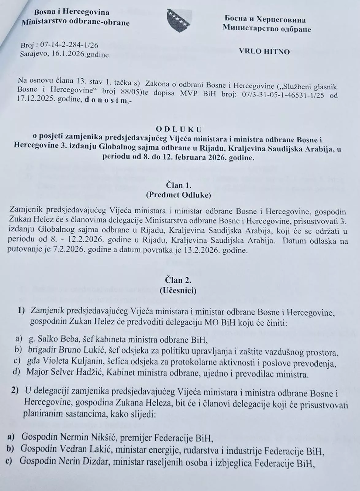 No, to nije sve. U Odluci se navodi da će u delegaciji Zukana Heleza biti i drugi članovi koji će prisustvovati planiranim sastancima u Rijadu, među kojima su premijer Federacije BiH Nermin Nikšić, federalni ministar energije, rudarstva i industrije Vedran Lakić i ministar raseljenih osoba i izbjeglica FBiH Nerin Dizdar.