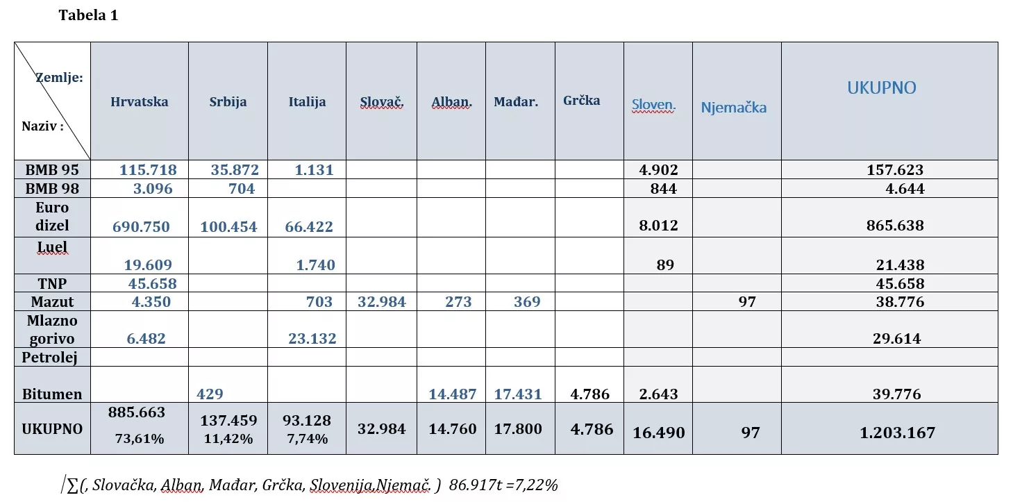 Najviše naftnih derivata uvezeno je iz Hrvatske, Italije i Srbije i to 93 posto cjelokupnog uvoza, dok je iz bh. entiteta Rs najviše nabavljeno od Optima Grupe i NIS Petrola iz Banje Luke.