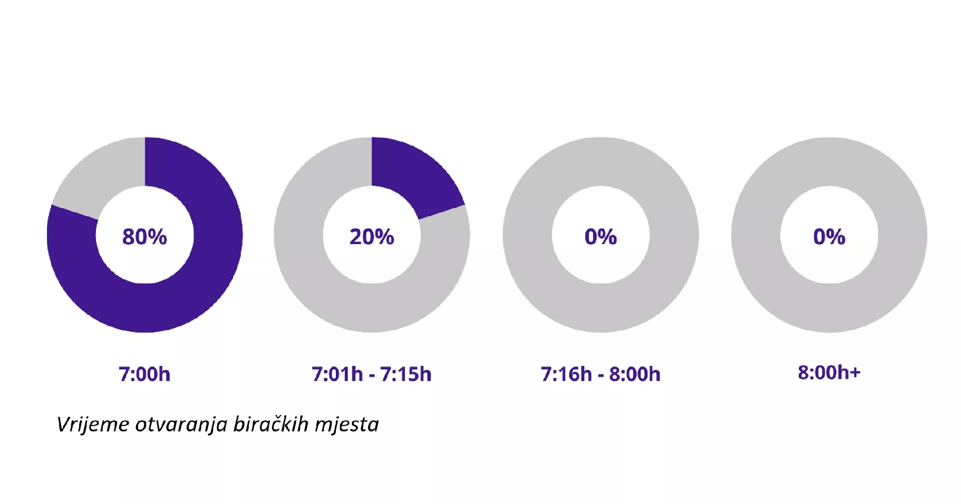Biračka mjesta su većinski otvorena na vrijeme bez značajnih kašnjenja. Tačno u 7.00 sati otvoreno je 80% posmatranih biračkih mjesta (16), a od 7.01 do 7.15 otvoreno je preostalih 20% biračkih mjesta (4).