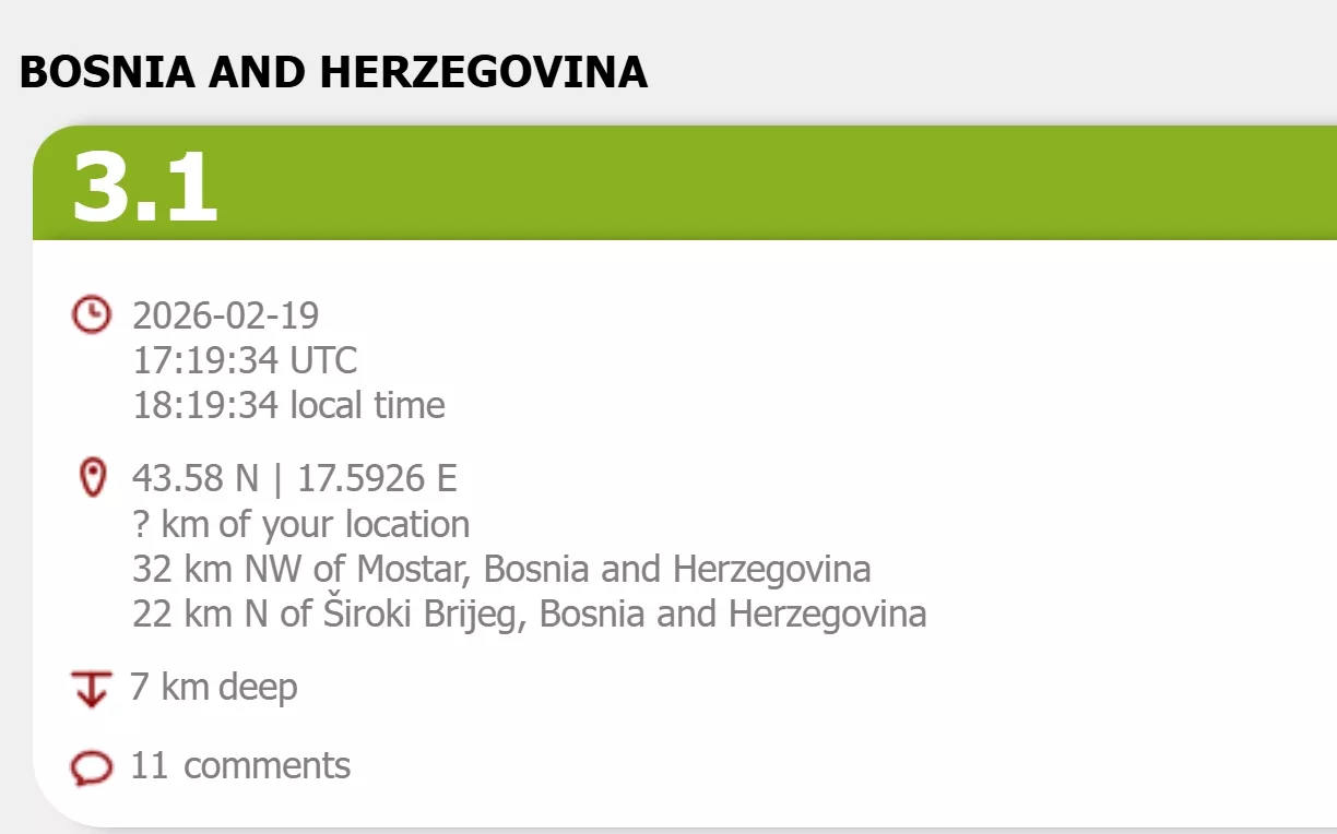 Epicentar je također bio na dubini od sedam kilometara, i to 32 kilometra sjeverozapadno od Mostara i 22 kilometra sjeverno od Širokog Brijega.