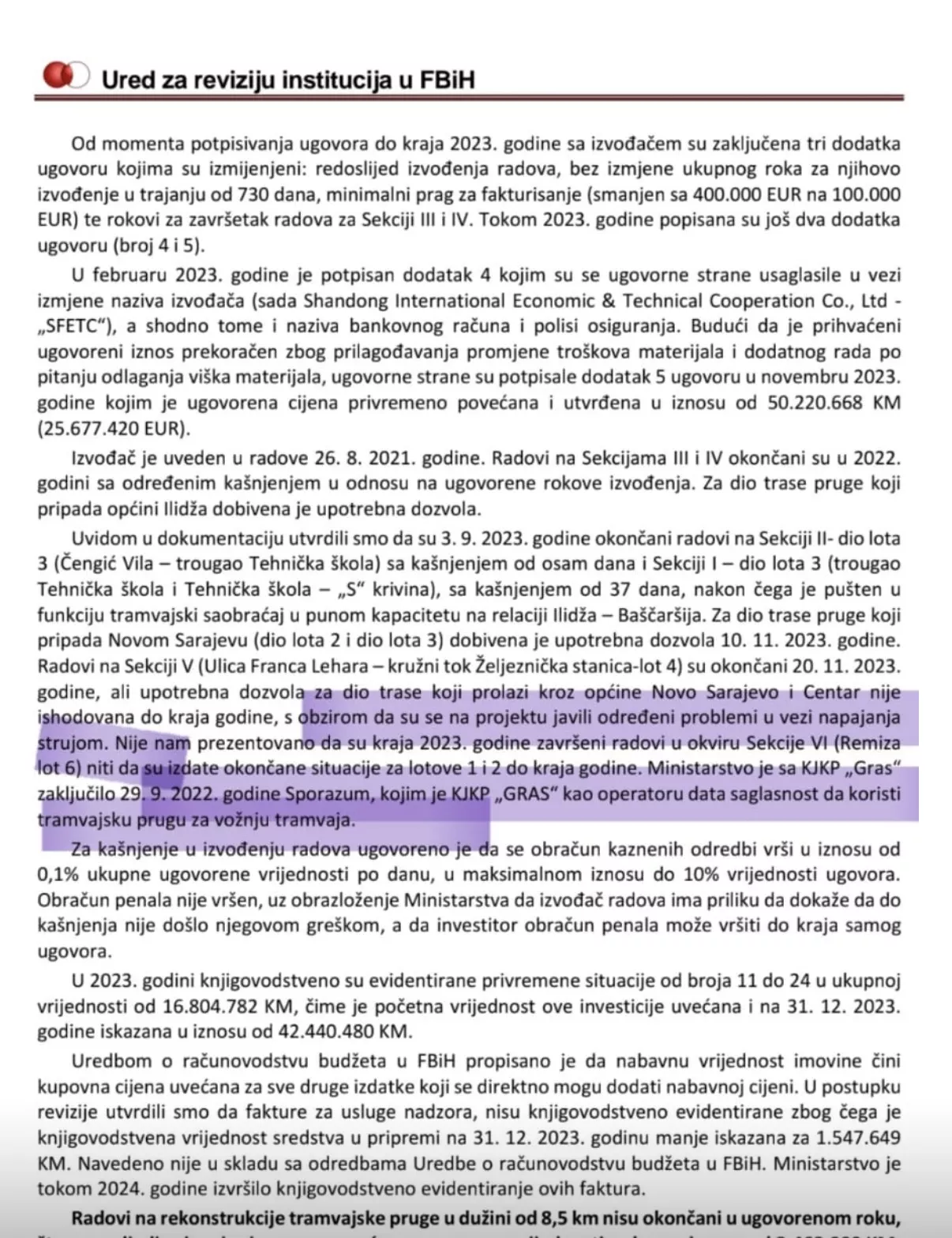 (Patria) - “Za dio trase pruge koji pripada Novom Sarajevu (dio lota 2 i dio lota 3) dobivena je upotrebna dozvola 10.11.2023. godine. Radovi na sekciji 5 (ulica Franca Lehara – kružni tok Željeznička stanica-lot 4) su okončani 20.11.2023. godine, ali upotrebna dozvola za dio trase koji prolazi kroz općine Novo Sarajevo i Centar nije ishodovana do kraja godine, s obzirom da su se na projektu javili određeni problemi u vezi napajanja strujom”, konstatovao je 2023. godine Ured za reviziju institucija u FBiH u izvještaju o reviziju Kantona Sarajevo.