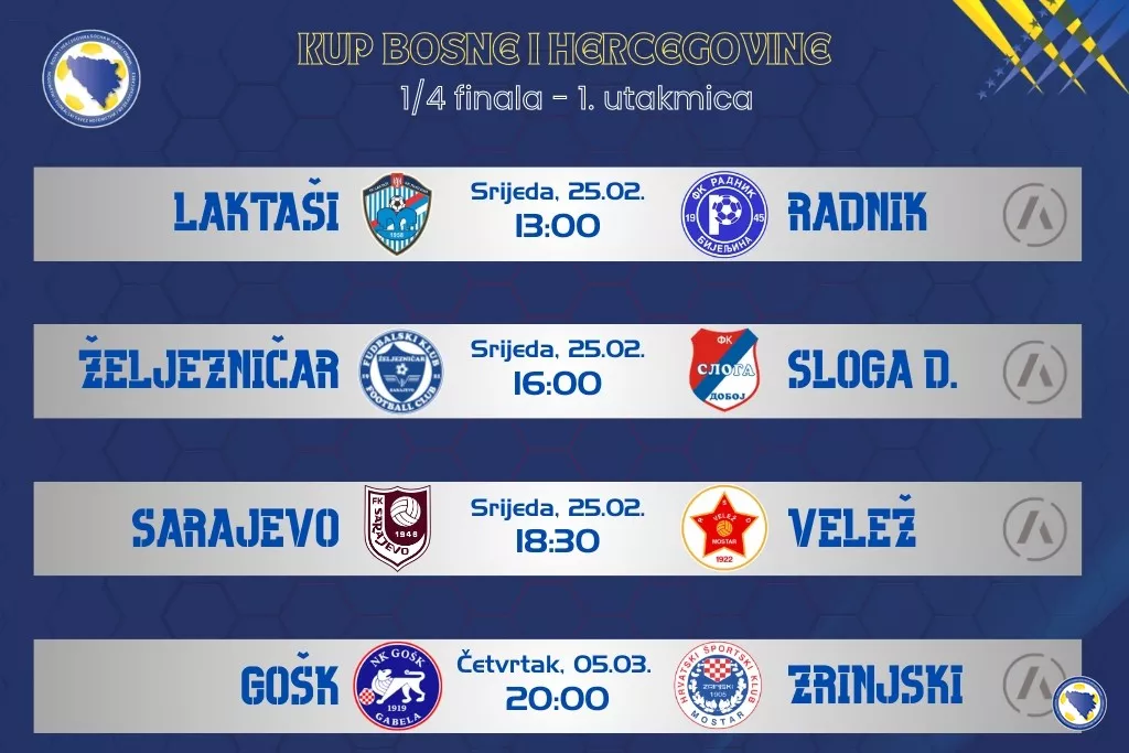 (Patria) - Određeni su arbitri za tri prve utakmice četvrtfinala Kupa BiH, koje se igraju u srijedu, 25. februara.