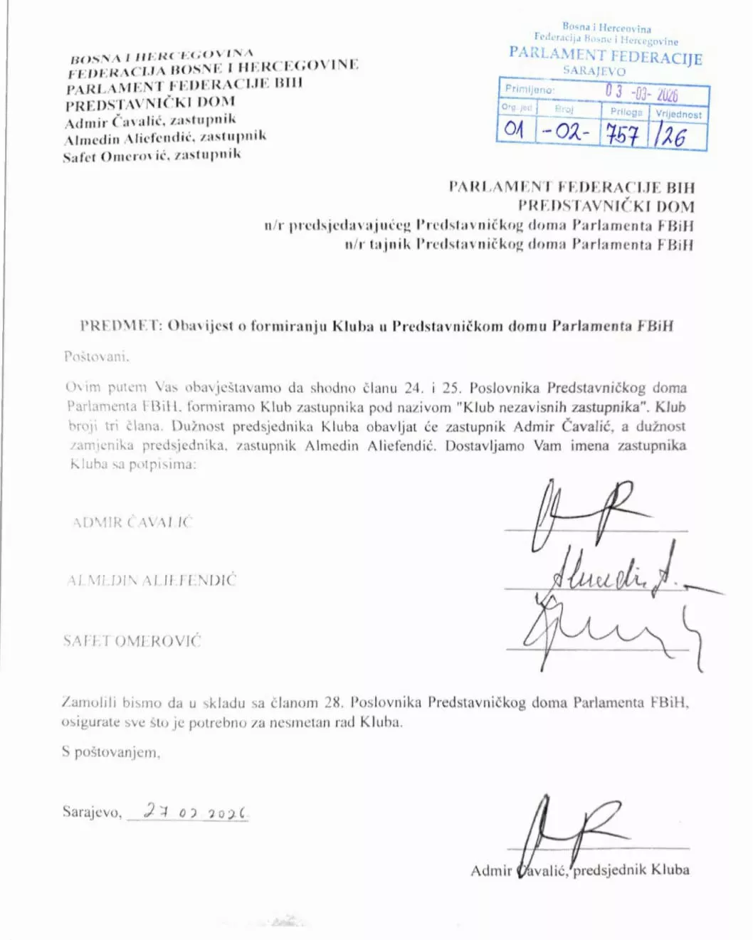 (Patria) - U Predstavničkom domu Parlamenta Federacije BiH formiran je novi klub nezavisnih zastupnika koji ima tri zastupnika Admira Čavalića, Almedina Aliefendića i Safeta Omerovića.