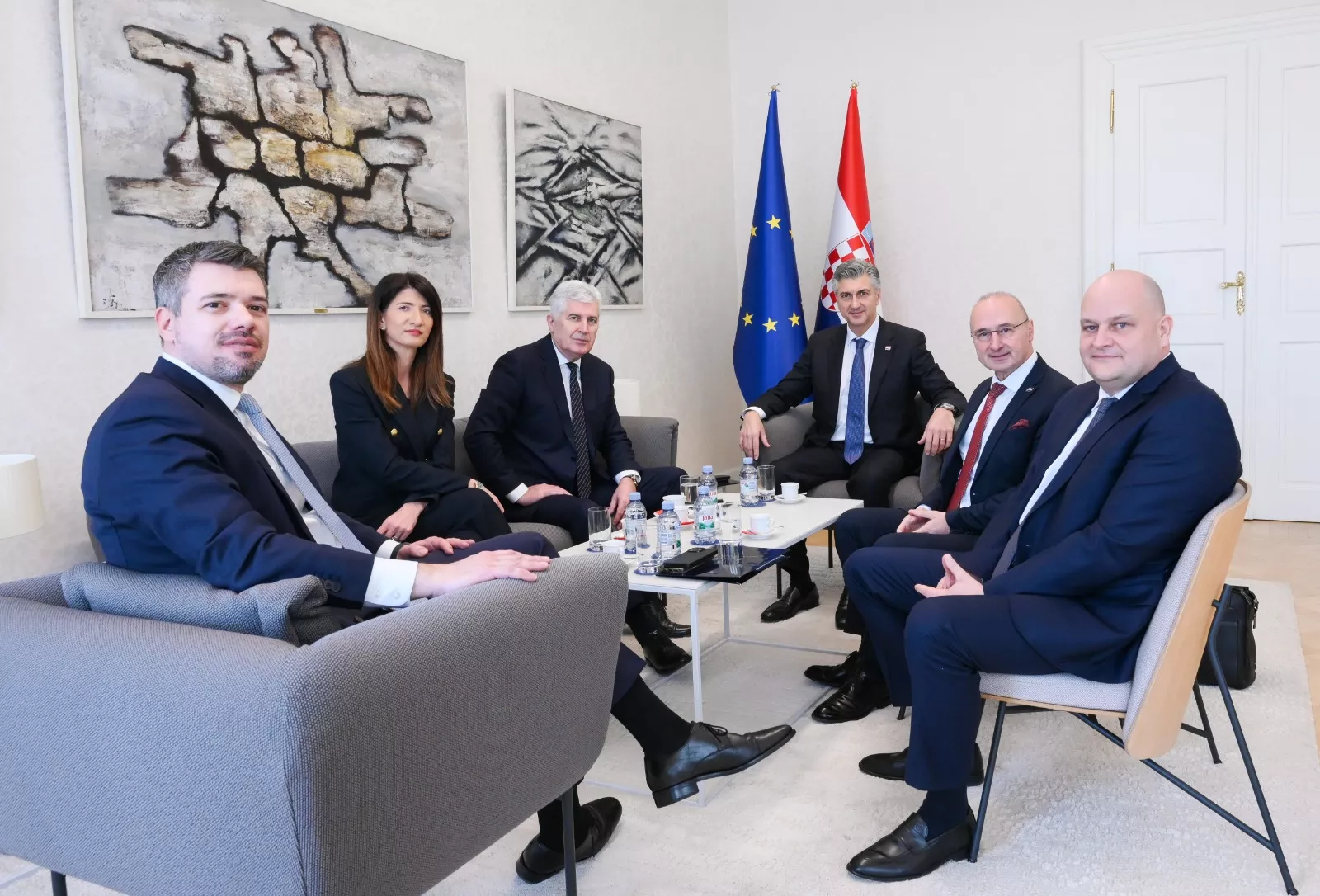 (Patria) - Zamjenik predsjedavajućeg Doma naroda Parlamentarne skupštine Bosne i Hercegovine (PSBiH) Dragan Čović i zastupnica u Zastupničkom domu PSBiH Darijana Filipović sastali su se danas u Banskim dvorima s predsjednikom Vlade Republike Hrvatske Andrejem Plenkovićem, te ministrom gospodarstva Antom Šušnjarom i ministrom vanjskih i europskih poslova Gordanom Grlićem Radmanom.