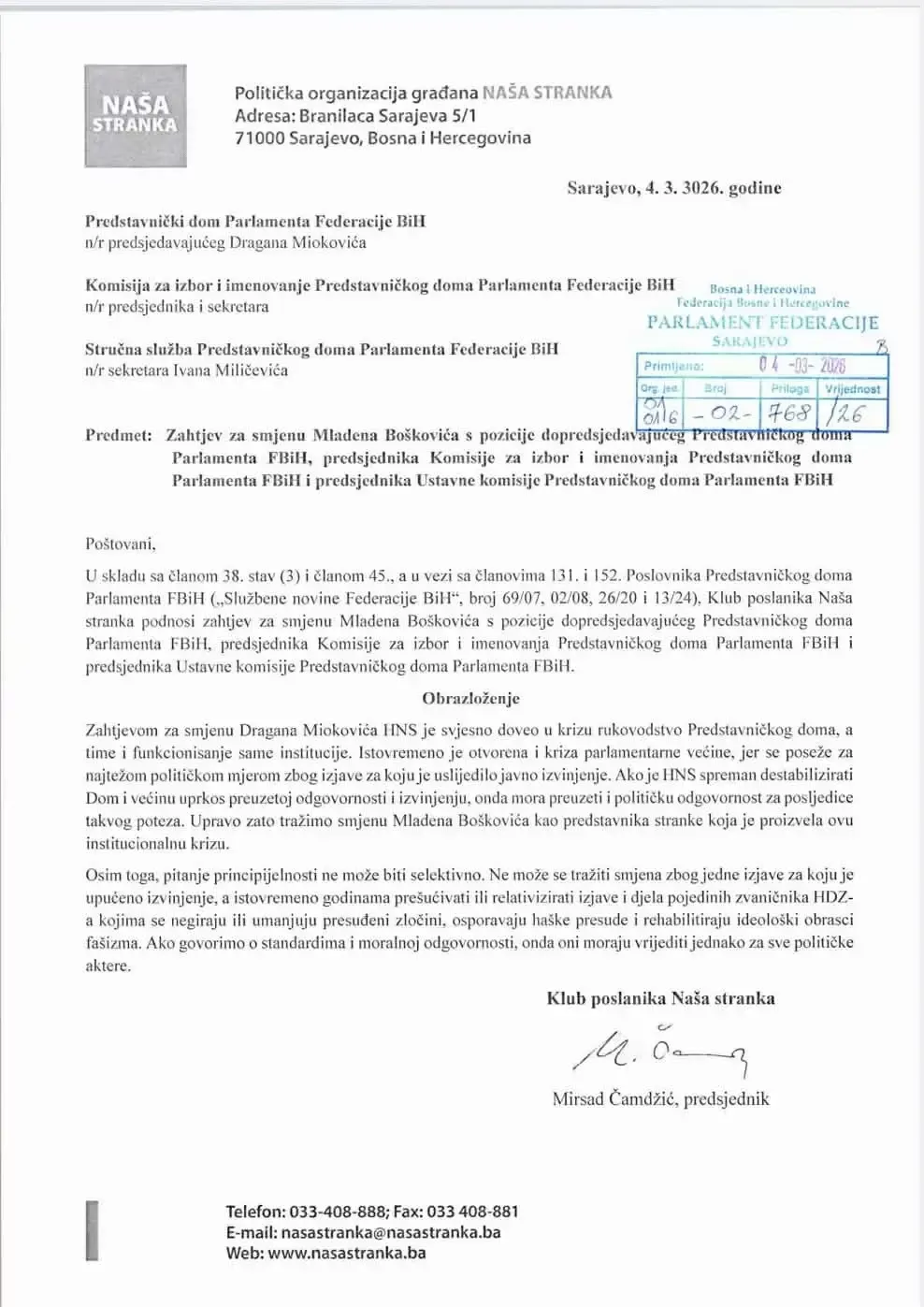 (Patria) - Klub zastupnika Naše stranke uputio je u parlamentarnu proceduru zahtjev za smjenu Mladena Boškovića sa funkcija dopredsjedavajućeg Zastupničkog doma Parlamenta FBiH, predsjednika Komisije za izbor i imenovanja te predsjednika Ustavne komisije ovog doma.