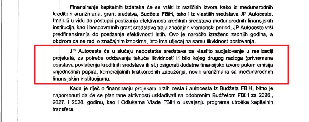 Obaveze koje uključuju otplate kredita, kamate i druge finansijske troškove veće su od ukupnih planiranih prihoda preduzeća. Samo po tom osnovu, Autoceste FBiH u naredne tri godine moraju osigurati 380 miliona KM u 2026., 389 miliona KM u 2027. i 327 miliona KM u 2028. godini.