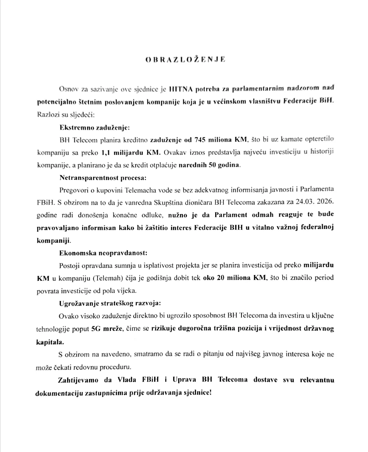 U obrazloženju za sazivanje sjednice zastupnici su naveli hitnu potrebu za parlamentarnim nadzorom nad potencijalno štetnim poslovanjem kompanije koja je u većinskom vlasništvu Federacije BiH.
