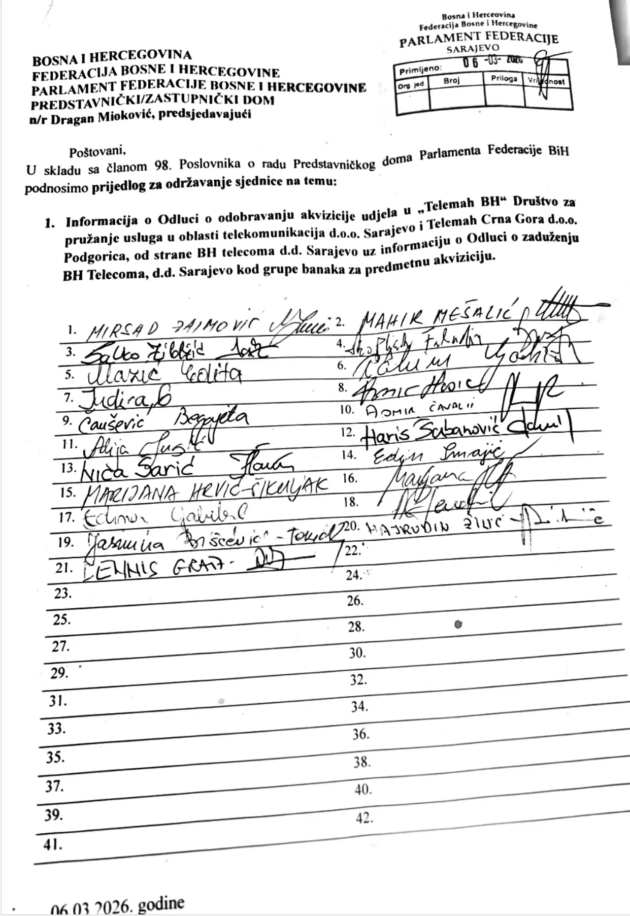 "S obzirom na navedeno, smatramo da se radi o pitanju od najvišeg javnog interesa koje ne može čekati redovnu proceduru. Zahtijevamo da Vlada FBiH i Uprava BH Telecoma dostave svu relevantnu dokumentaciju zastupnicima prije održavanja sjednice", poručili su zastupnici u zahtjevu.