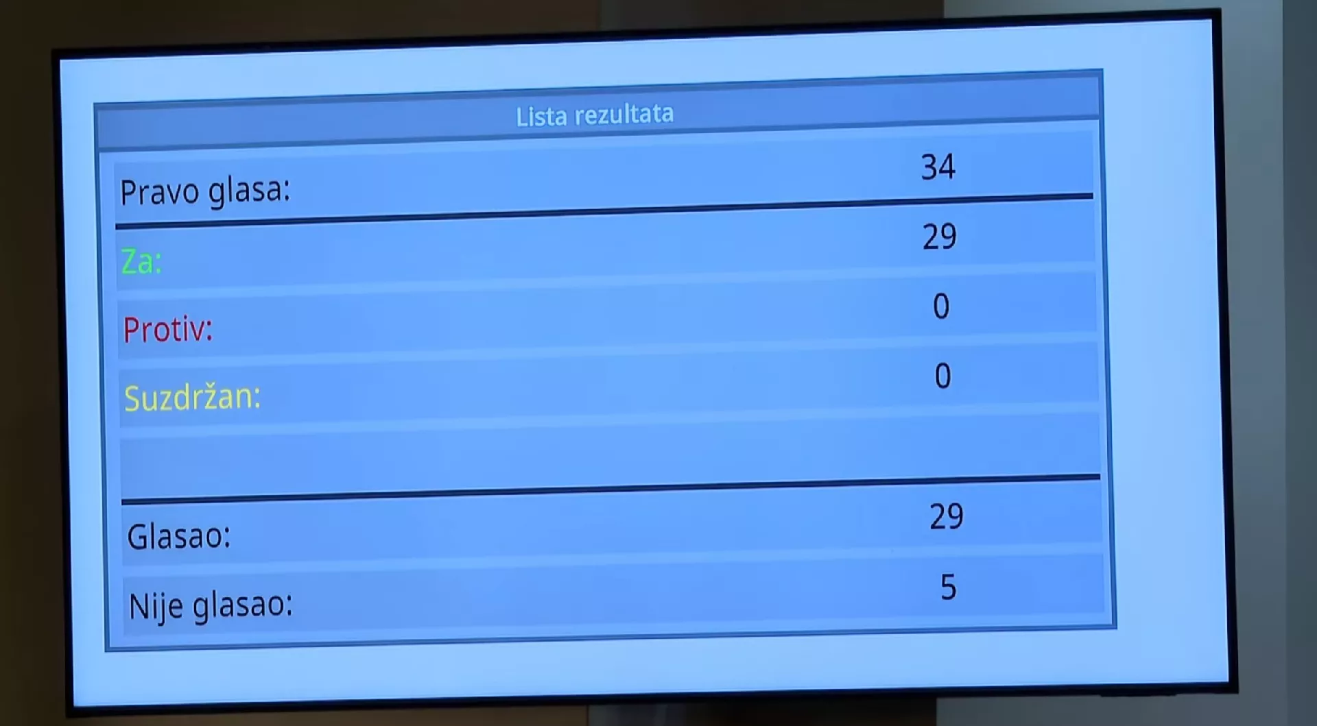 Za prihvatanje ostavke glasalo je 29 zastupnika, dok protiv i suzdržanih nije bilo.