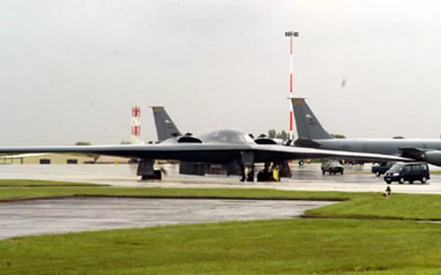 Bombarder američkih zračnih snaga B-1 Lancer sletio je u Fairford u subotu. Američki avion C-5 Galaxy također se mogao vidjeti na pisti baze, dok su proturatni prosvjednici demonstrirali ispred.