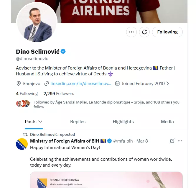 Selimović je kadar NiP-a, a aktuelni je savjetnik ministra vanjskih poslova BiH Elmedina Konakovića. Još jučer je na svom X nalogu dijelio čestitku Ministarstva vanjskih poslova BiH povodom 8. marta - Dana žena, a danas je na drugoj funkciji.