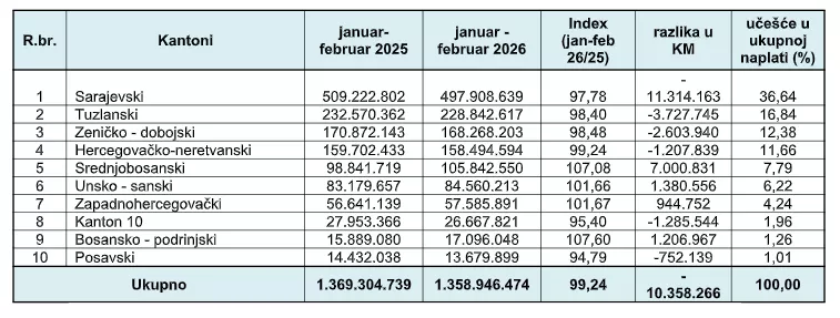 (Patria) - Porezni obveznici Federacije BiH u periodu januar-februar 2026. godine uplatili su 1.358.946.474 KM javnih prihoda. Prednjači Kanton Sarajevo sa 497.908.639 KM za dva mjeseca.