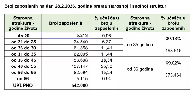 Broj zaposlenih prema prebivalištu zaposlenika na dan 28.2.2026. godine je 542.080, dok je na kraju januara iznosio 542.373 zaposlenih.