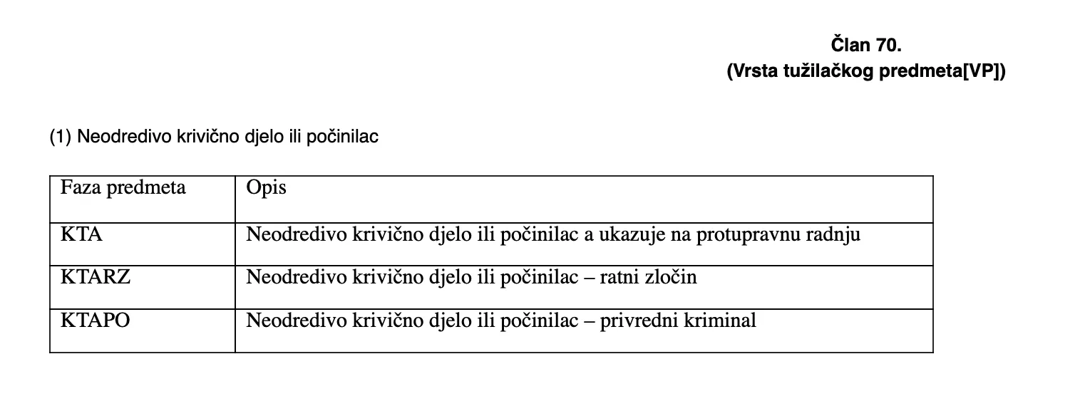 Naime, VSTV je još 2015. godine usvojio Pravilnik o sistemu za automatsko upravljanje predmetima u tužilaštvima u kojem je jasno navedeno kako se označavaju predmeti po određenim oblastima. Evo jedne od tačaka tog Pravilnika.