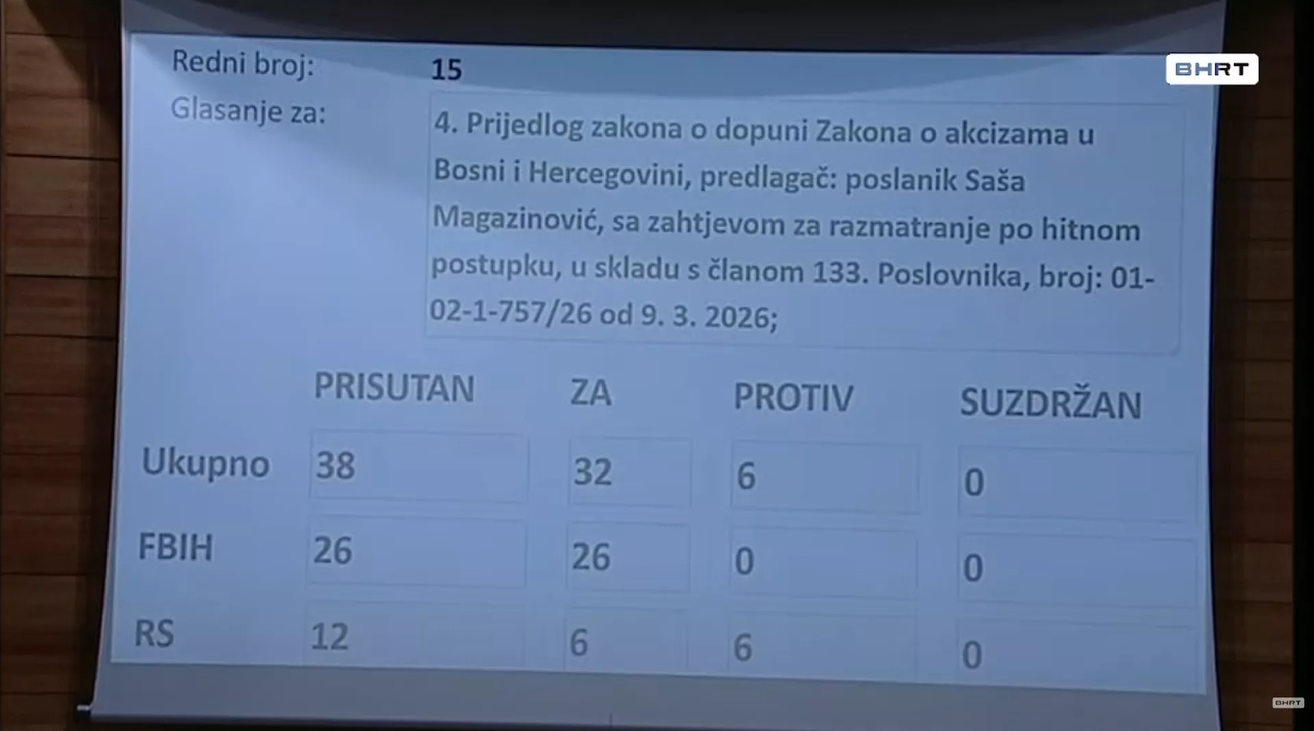 Svi su podržali Zakon, osim nekoliko zastupnika SNSD-a. Slijedi Dom naroda. Mislim da će se desiti ta sjednica jer je Dom naroda ranije jednoglasno prihvatao mjeru intervencije na iznos visine akcize.