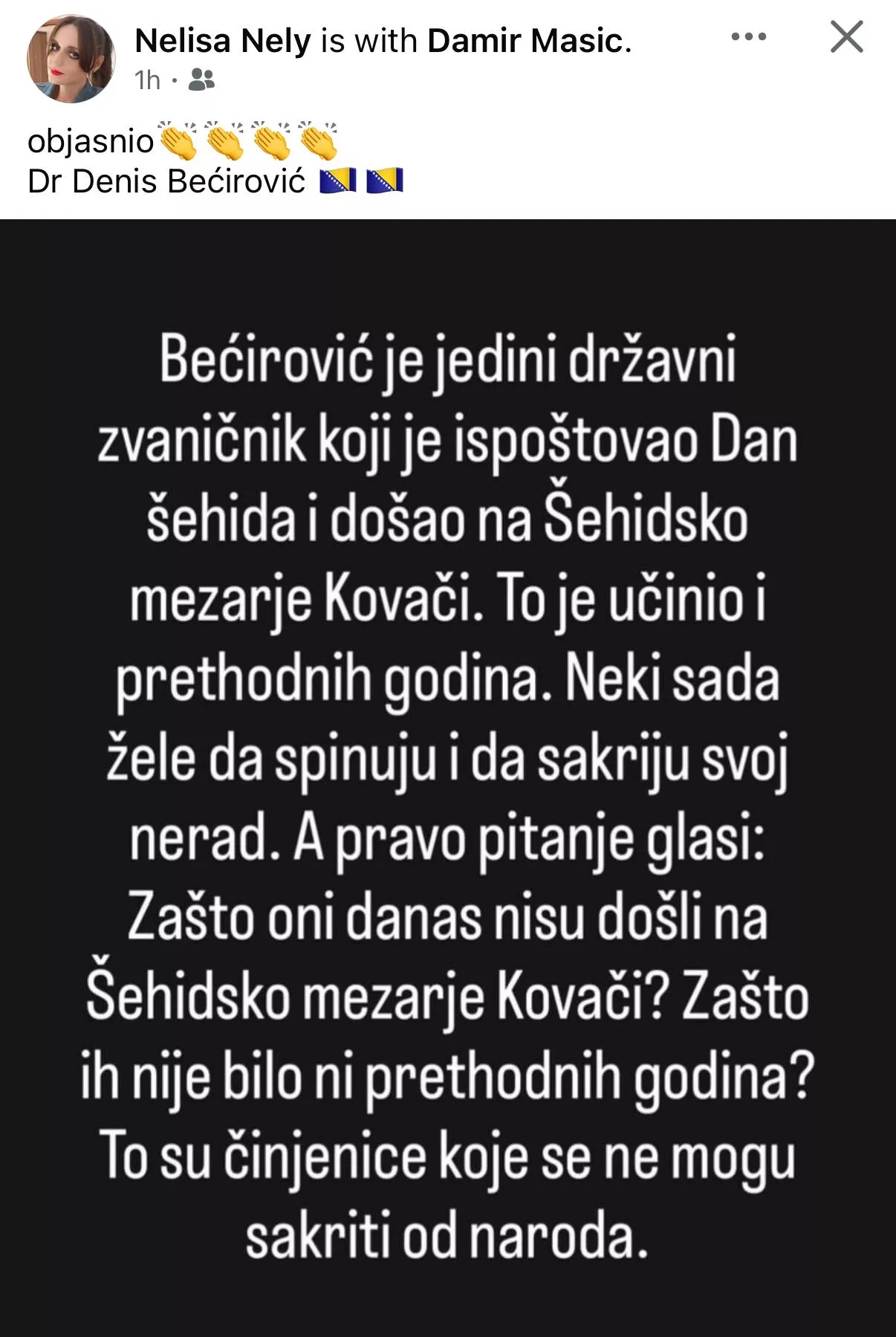 U spornoj objavi se ističe da je Denis Bećirović „jedini državni zvaničnik“ koji je prisustvovao obilježavanju na Šehidsko mezarje Kovači, uz tvrdnje da drugi zvaničnici godinama izostaju s ovog događaja.