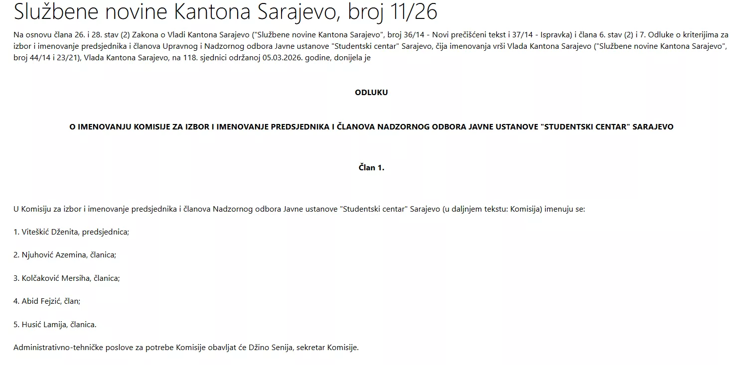 Vlada Kantona Sarajevo je na sjednici 5. marta donijela odluku o imenovanju Komisije za izbor i imenovanje predsjednika i članova Nadzornog odbora ove ustanove. U Komisiju za izbor i imenovanje predsjednika i članova Nadzornog odbora Javne ustanove "Studentski centar" Sarajevo imenovani su: Dženita Viteškić, predsjednica, Azemina Njuhović, članica, Mersiha Kolčaković, članica, Abid Fejzić, član i Lamija Husić, članica.