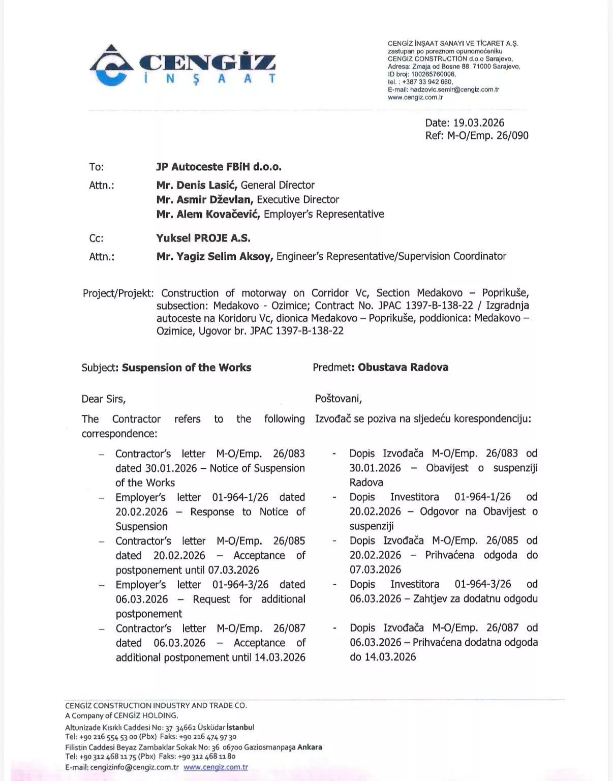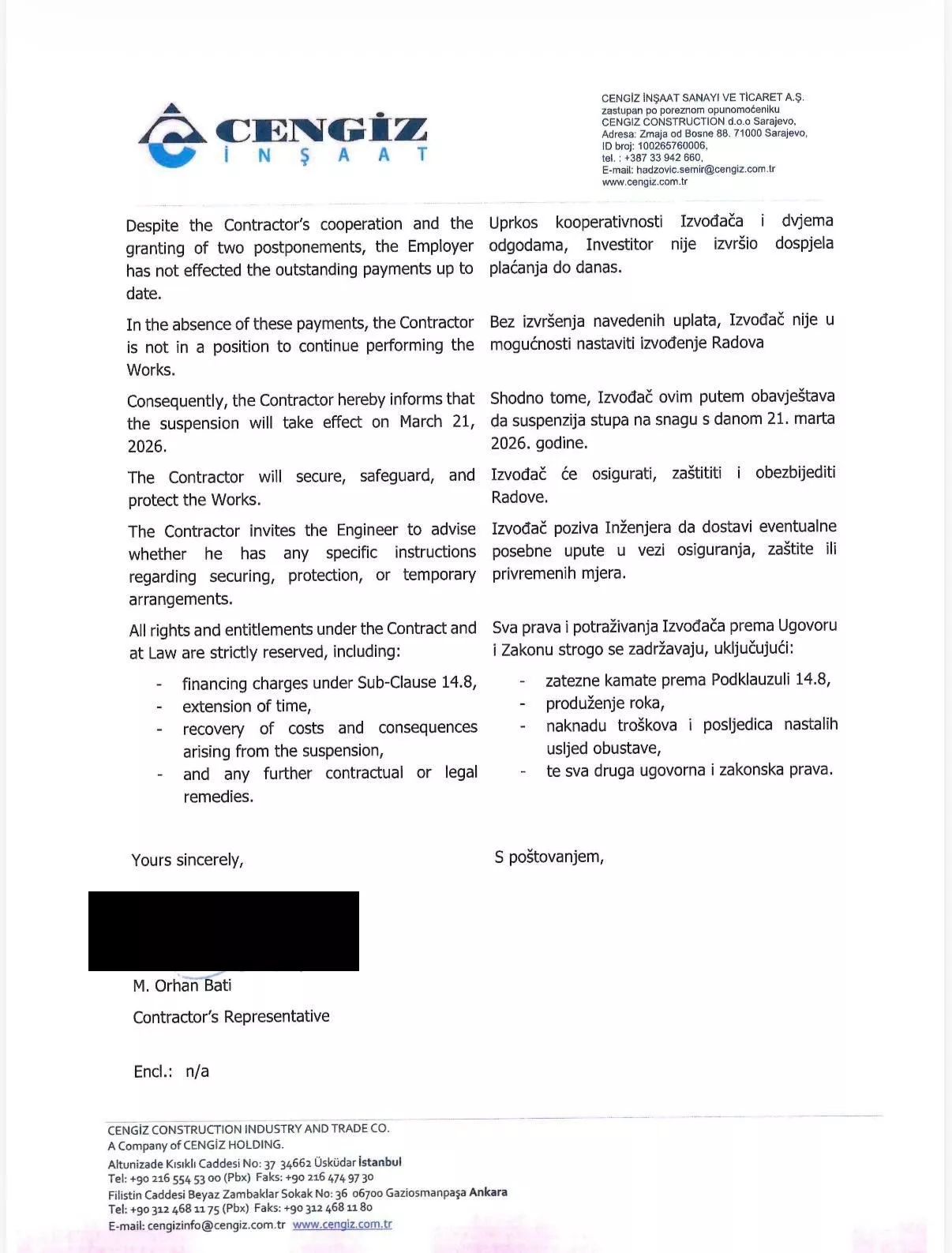 “Uprkos kooperativnosti Izvođača i dvjema odgodama, Investitor nije izvršio dospjela plaćanja do danas. Bez izvršenja navedenih uplata, Izvođač nije u mogućnosti nastaviti izvođenje Radova. Shodno tome, Izvođač ovim putem obavještava da suspenzija stupa na snagu s danom 21. marta 2026. godine. Izvođač će osigurati, zaštititi i obezbijediti Radove. Izvođač poziva Inženjera da dostavi eventualne posebne upute u vezi osiguranja, zaštite ili privremenih mjera. Sva prava i potraživanja Izvođača prema Ugovoru i Zakonu strogo se zadržavaju, uključujući: zatezne kamate prema Podklauzuli 14.8; produženje roka; naknadu troškova i posljedica nastalih usljed obustave, te sva druga ugovorna i zakonska prava”, navodi se u dopisu koji je predstavnik izvođača radova Cengiza uputio generalnom direktoru Autocesta FBiH Denisu Lasiću, izvršnom direktoru Asmiru Dževlanu i predstavniku preduzeća Alemu Kovačeviću 19. marta.