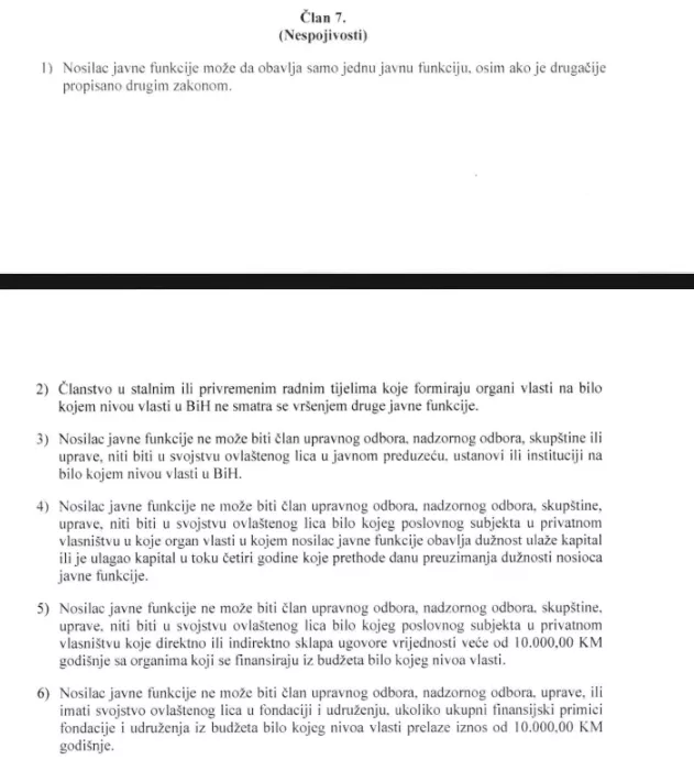 Riječ je o sveobuhvatnom zakonu koji ima ukupno 35 članova. Od 2013. godine ne postoji funkcionalno tijelo za rješavanje pitanja sukoba interesa. Istraživanje Transparency Internationala je pokazalo da više od 200 funkcionera na nivou Federacije BiH obnaša po dvije li čak više javnih funkcija, ali sukob interesa niko ne utvrđuje.