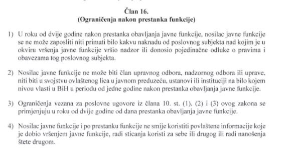 Posebno se regulišu ograničenja nakon prestanka javne funkcije, odnosno zabrana članstva u upravnim ili nadzornim odborima godinu nakon prestanka javne funkcije.