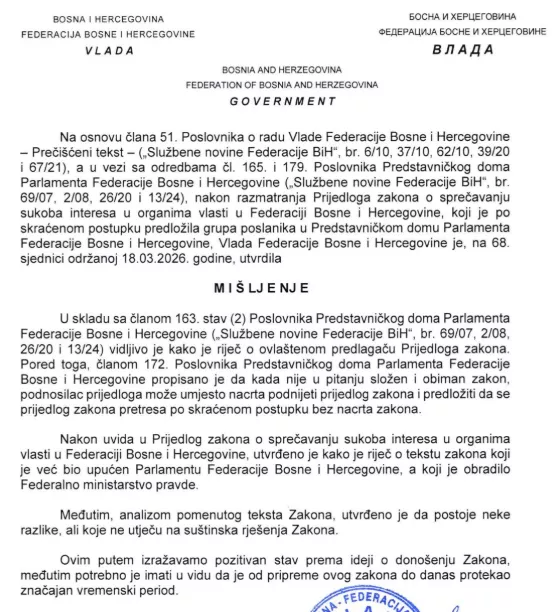 (Patria) - Vlada FBiH dala je prošle sedmice pozitivno mišljenje na Prijedlog zakona o spriječavanju sukoba interesa u organima vlasti u FBiH koji je u proceduru uputilo 13 federalnih zastupnika iz više političkih stranaka i vlasti i opozicije. Sada bi zakon trebao biti upućen u parlamentarnu proceduru.