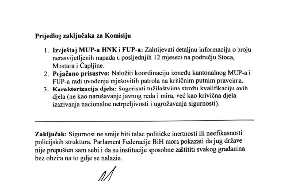 'Posljednjih mjeseci svjedočimo seriji brutalnih napada koji su ozbiljno uzdrmali osjećaj sigurnosti građana u južnom dijelu Federacije BiH. Incidenti koji uključuju presretanje automobila na magistralnim cestama, fizičke napade na povratnike u Stocu, te organizovane nerede u Mostaru i Čapljini, više se ne mogu tretirati kao izolovani slučajevi huliganizma', navodi se u obrazloženju inicijative.