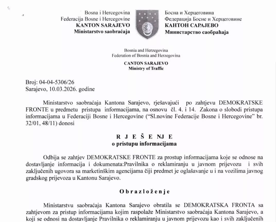 "Odbija se zahtjev Demokratske fronte za pristup informacijama koje se odnose na dostavljanje informacija i dokumenata: Pravilnika o reklamiranju u javnom prijevozu i svih zaključenih ugovora s marketinškim agencijama čiji predmet je oglašavanje u i na vozilima javnog gradskog prijevoza u KS", piše u Rješenju Ministarstva saobraćaja KS od 10. marta.