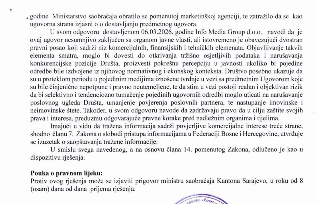 (Patria) - Ministarstvo saobraćaja Kantona Sarajevo (KS) odbilo je objaviti ugovor s banjalučkom marketinškom agencijom Info Media Group o reklamiranju na i u vozilima GRAS-a, piše Istraga.ba.