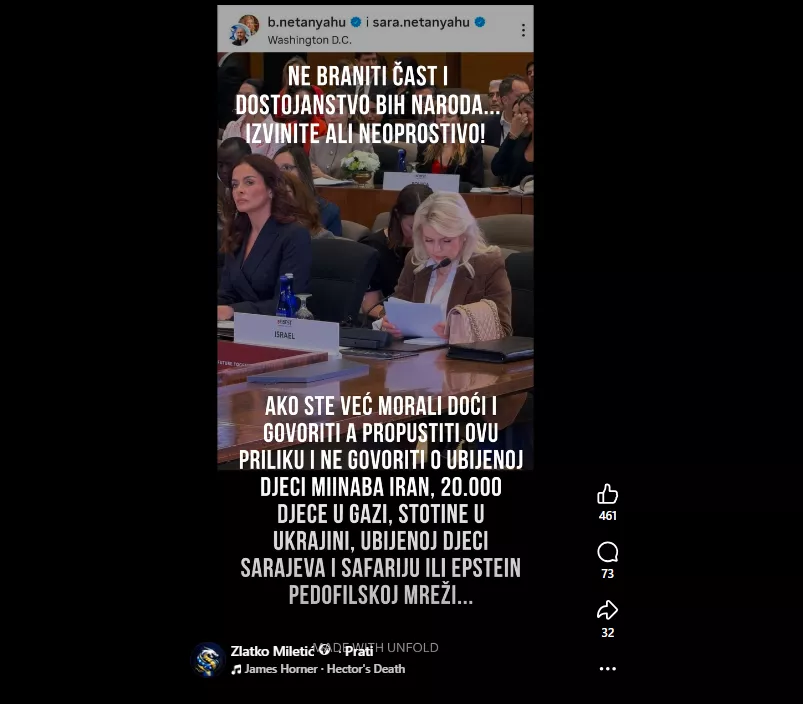 „Ne braniti čast i dostojanstvo naroda u Bosni i Hercegovini… izvinite, ali neoprostivo. Ako ste već morali doći i govoriti, a propustiti ovu priliku i ne govoriti o ubijenoj djeci Minaba (Iran), 20.000 djece u Gazi, stotinama u Ukrajini, ubijenoj djeci Sarajeva, ili o Epsteinovoj pedofilskoj mreži“, napisao je Miletić.