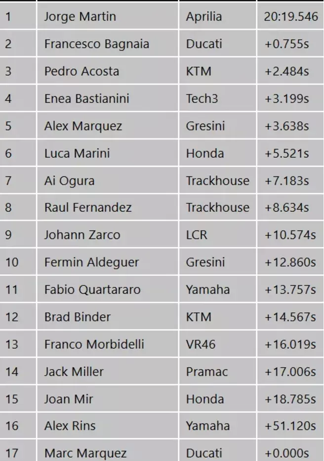 Bagnaja odmiče, Pedro Acosta na KTM preuzima drugo mjesto, a Aprilije Martina i Marca Bezzecchija ga love. Ubrzo ga obilazi Martin, pa i Bezz, da bi u klubskom duelu Bezz obišao i Martina i krenuo u potjeru za Ducatijem Bagnaje.