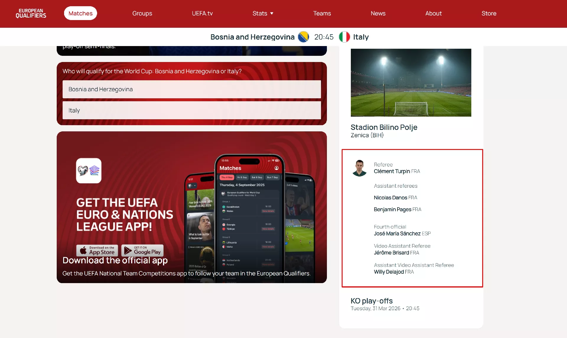 (Patria) - Evropska fudbalska federacija (UEFA) odredila je službena lica za finalnu utakmicu baraža za Svjetsko prvenstvo između Bosne i Hercegovine i Italije.