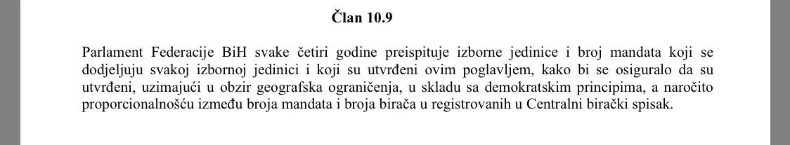 Izborni zakon BiH u članu 10.9 određuje da Parlament Federacije BiH svake četiri godine preispituje izborne jedinice i broj mandata kako bi se osiguralo da su utvrđeni, uzimajući u obzir geografska ograničenja, u skladu sa demokratskim principa, a naročito proporcionalnošću između broja mandata i broja birača registrovanih u Centralni birački spisak.