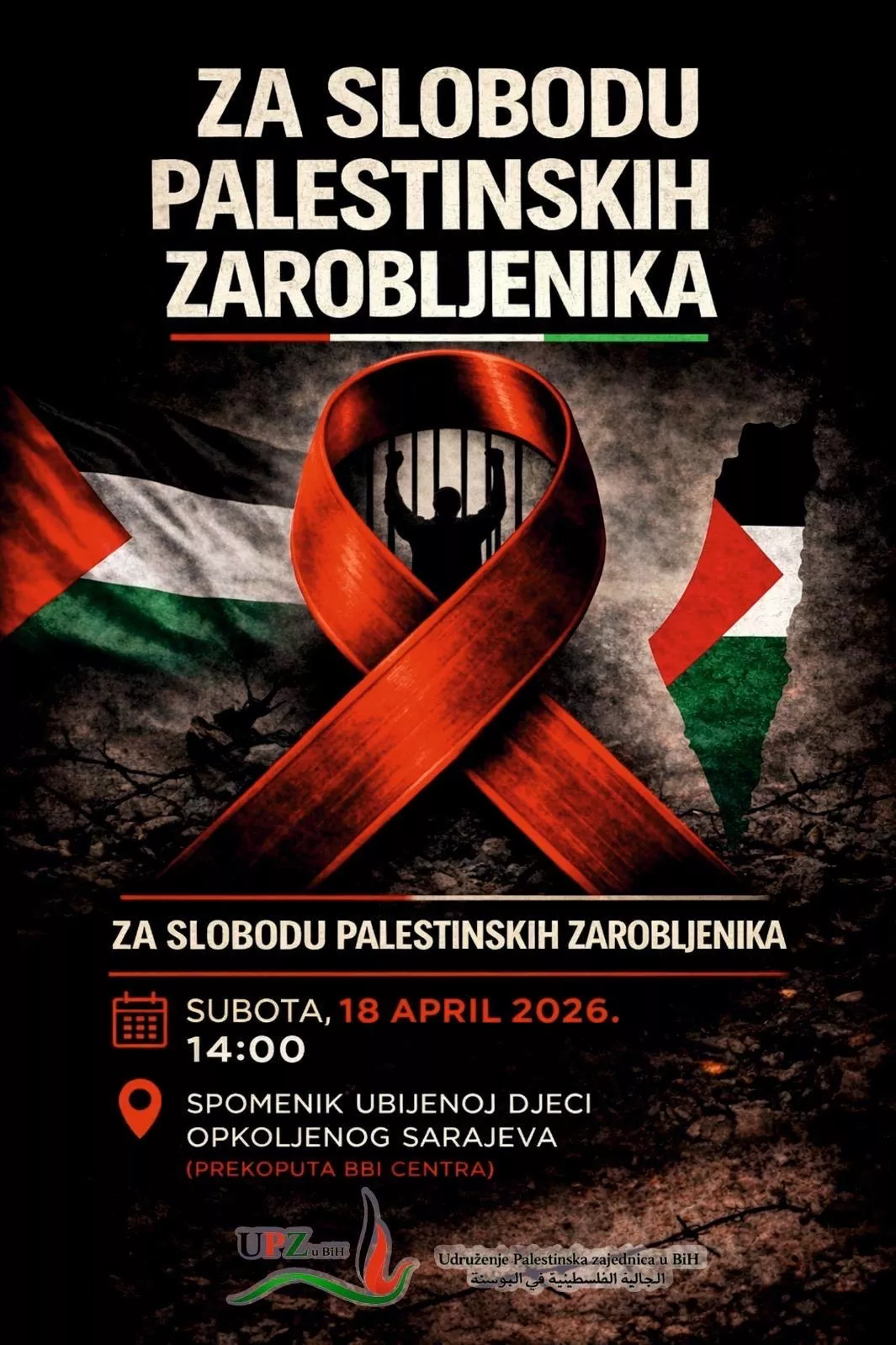 Skup solidarnosti sa palestinskim zatvorenicima bit će održan u subotu, 18. aprila, u Velikom parku - ispred Spomenika ubijenoj djeci Sarajeva, sa početkom u 14.00 sati.