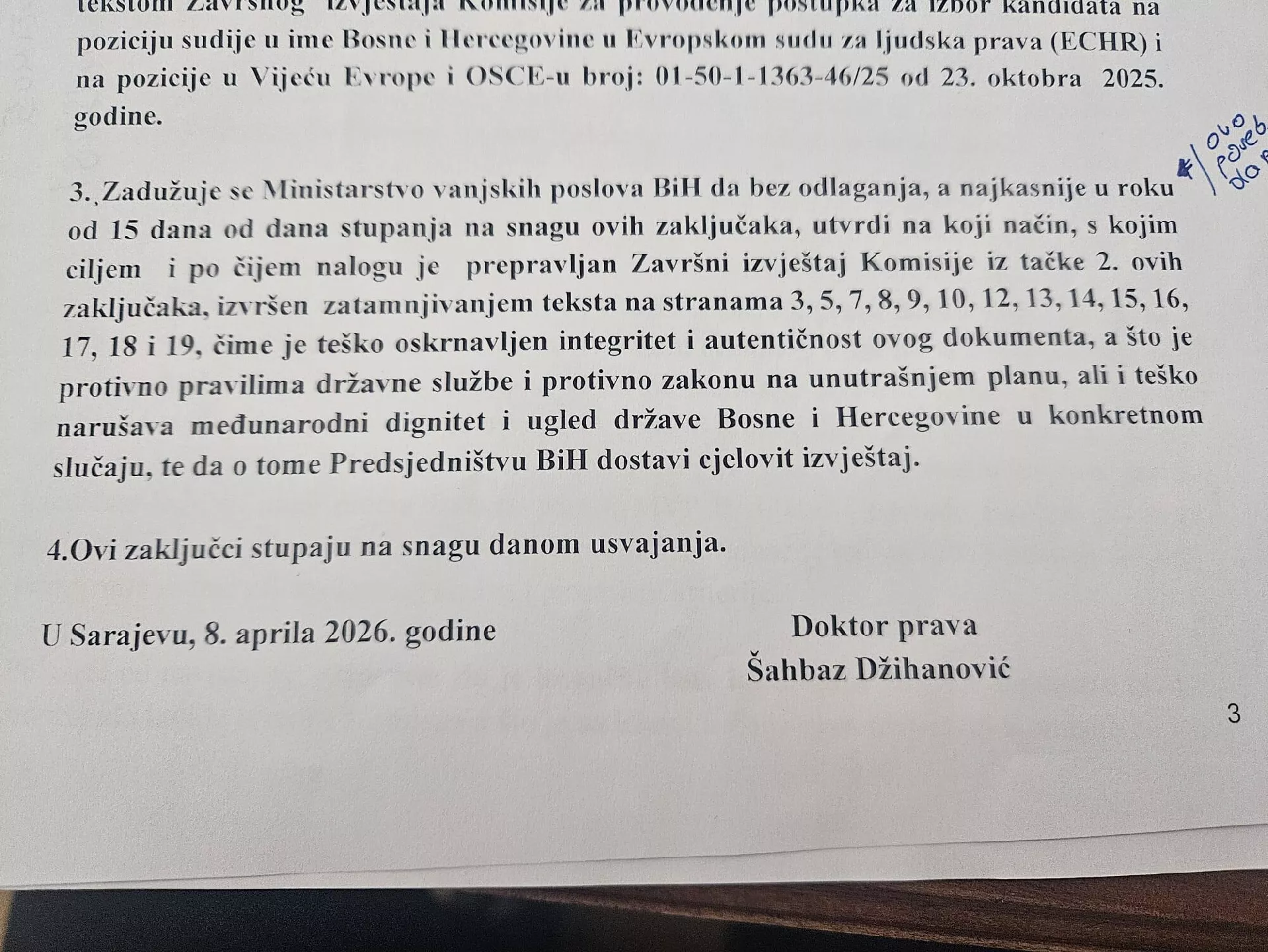 "Zadužuje se Ministarstvo vanjskih poslova BiH da bez odlaganja, a najkasnije u roku od 15 dana od dana stupanja na snagu ovih zaključaka, utvrdi na koji način, s kojim ciljem i po čijem nalogu je prepravljan Završni izvještaj Komisije iz tačke 2. ovih zaključaka, izvršen zatamnjivanjem teksta na stranama 3, 5, 7, 8, 9, 10, 12, 13, 14, 15, 16, 17, 18 i 19, čime je teško oskrnavljen integritet i autentičnost ovog dokumenta, a što je protivno pravilima državne službe i protivno zakonu na unutrašnjem planu, ali i teško narušava međunarodni dignitet i ugled države Bosne i Hercegovine u konkretnom slučaju, te da o tome Predsjedništvu BiH dostavi cjelovit izvještaj."