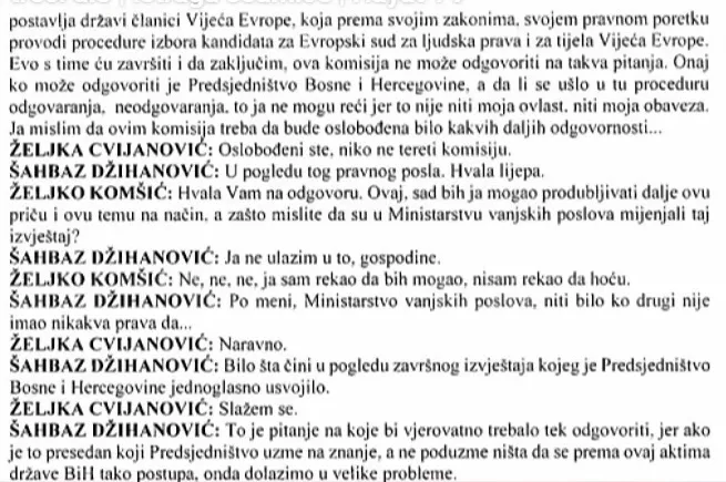 - Dozvolite mi da kažem - upoznat sam, ne znam kako, kakav je izvještaj MVP BiH poslao Vijeću Evrope, ali imam dokaze gdje sekretar MVP-a traži od Sekretarijata Predsjedništva da mu se dostavi izvještaj u Word statusu i taj izvještaj, ovaj izvještaj komisije je precrtavan, odnosno nije vjerodostojno dostavljen Vijeću Evrope - rekao je Džihanović početkom aprila na sjednici Predsjedništva BiH.